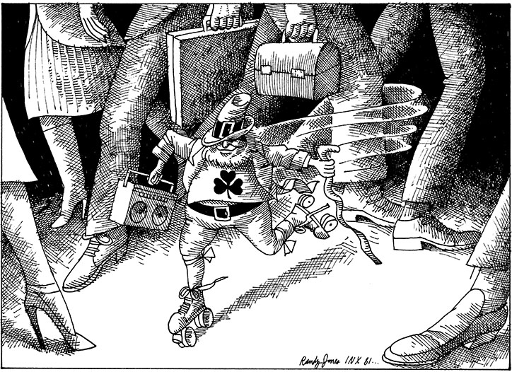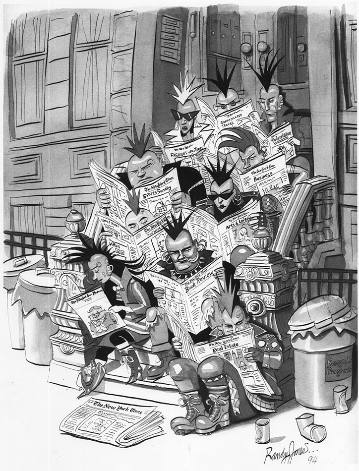 In the pre-digital news-biz, drawings were delivered by hand or done on site. The 9th-floor art department housed a warren of spare desks, the so-called Bullpen, where freelancers created illustrations on the spot. Randy became a master of the quick-draw form and a gregarious fixture on the scene, amusing the troops and welcoming newcomers. It's where I met him in the early 1980.