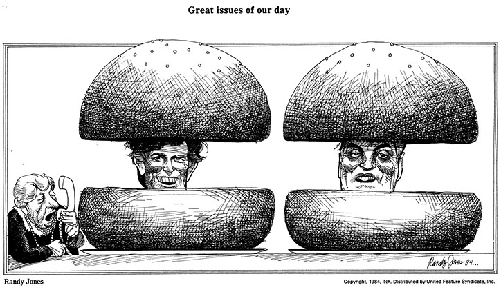 Along with several others of those opinionated artists who felt constrained by the propriety of the Grey Lady, Randy help found the syndication service Inx which offered a platform for their unvarnished takes on the news. And the opportunity for camaraderie amongst toilers in a solitary profession. The social aspect of the alliance was nearly as rewarding as the creative one, and no one supplied greater warmth and friendship than Mr. Jones. Here's more on the service which from its start provided a showcase for Randy's great pen work and his brilliant caricatures. Ronald Reagan proved a perfect foil.