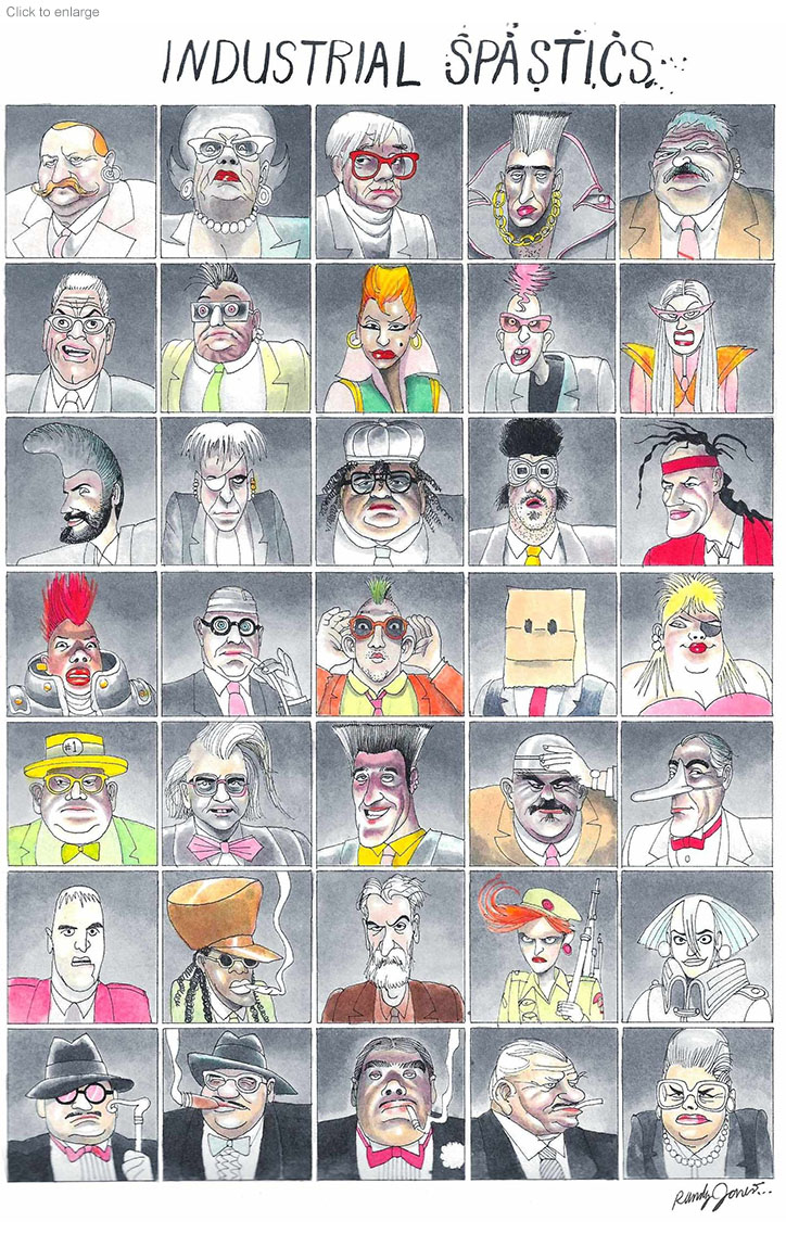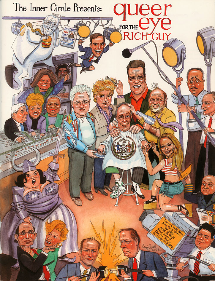 At his peak, Randy was the busiest illustrator I knew with newspapers, magazines, book publishers, ad agencies, and galleries among his clients. One of his longest-lasting and most fruitful gigs was The Inner Circle show each year in NYC. Here’s more about the annual event –– I can’t imagine how they’ll get on without his riotous programs and projected sets.