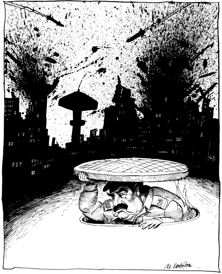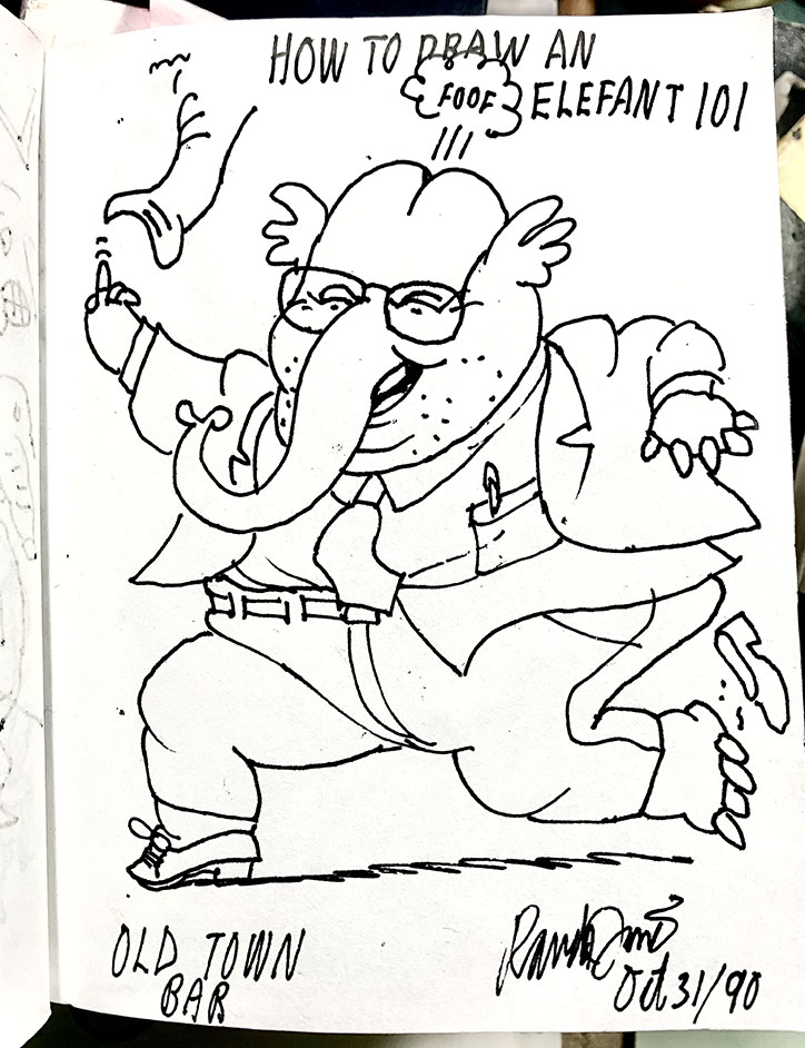 In the pre-digital news-biz, drawings were delivered by hand or done on site. The 9th-floor art department housed a warren of spare desks, the so-called Bullpen, where freelancers created illustrations on the spot. Randy became a master of the quick-draw form and a gregarious fixture on the scene, amusing the troops and welcoming newcomers. It's where I met him in the early 1980.