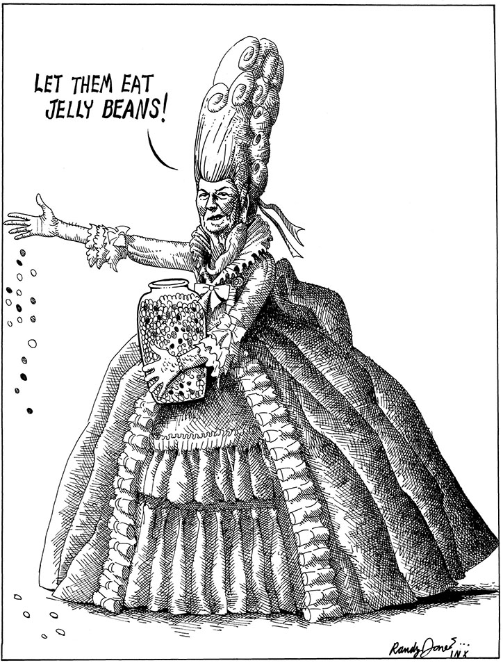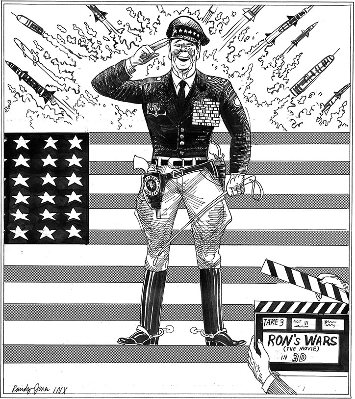Along with several others of those opinionated artists who felt constrained by the propriety of the Grey Lady, Randy help found the syndication service Inx which offered a platform for their unvarnished takes on the news. And the opportunity for camaraderie amongst toilers in a solitary profession. The social aspect of the alliance was nearly as rewarding as the creative one, and no one supplied greater warmth and friendship than Mr. Jones. Here's more on the service which from its start provided a showcase for Randy's great pen work and his brilliant caricatures. Ronald Reagan proved a perfect foil.